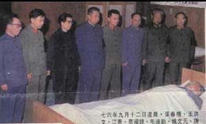 Jiang Qing (de negro) y otros miembros de su facción velan el cadáver de Mao.