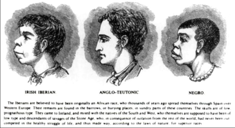 Ilustración racista de la influyente revista "Harper's Weekly" (1899) en la que se hace una supuesta similitud entre el "irlandés ibérico" y el "negro" en contraste con el elevado "angloteutónico".