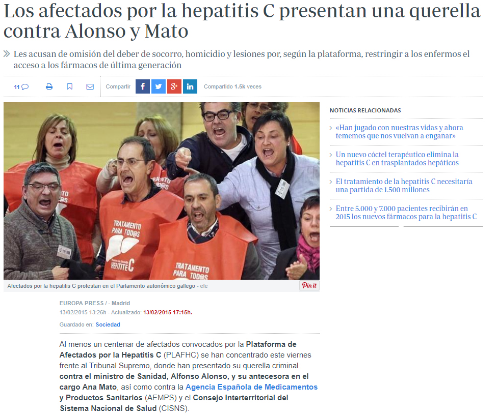 QUERELLA CRIMINAL PRESENTADA POR ENFERMOS DE VHC INTEGRANTES DE LA PLATAFORMA DE AFECTADOS POR LA HEPATITIS C (PLAFHC), REDACTADA POR LOS ABOGADOS DE AUSAJ JESÚS DIAZ FORMOSO Y BELÉN LUJÁN SÁEZ, PRESENTADA ANTE EL TRIBUNAL SUPREMO EN FEBRERO DE 2015.