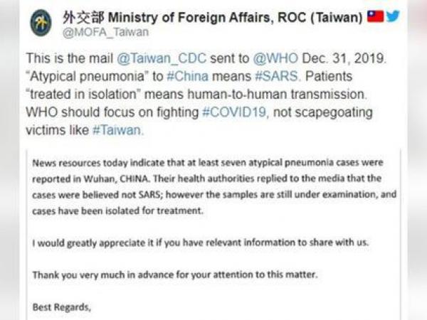 Y agrega: "El 31 de diciembre de 2019, Taiwán envió un correo electrónico al punto focal del Reglamento Sanitario Internacional (RSI) de la Organización Mundial de la Salud (OMS), informando a la OMS sobre su comprensión de la enfermedad y también solicitando más información de la OMS”.