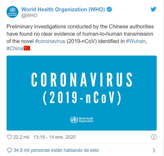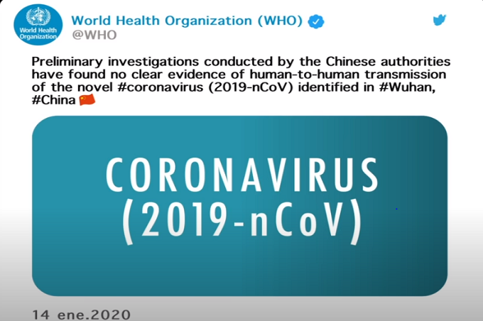 “Las investigaciones preliminares de las autoridades chinas no han hallado evidencia clara de transmisión humano-humano del nuevo coronavirus identificado en Wuhan, China” - OMS, 14 de enero de 2020.