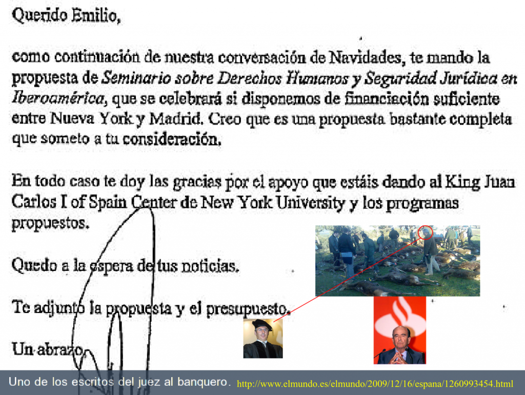 Y ahora el “ni directa ni indirectamente” deja en evidencia a su autor, ya que en las cartitas de afecto amical, pide Garzón a Botín dinero para el presupuesto de sus conferencias en Nueva York, lo llama “querido Emilio”, envía “un enorme abrazo”, y bajo su firma aparece la inclusión de “Magistrado-Juez”, cartas de 2005 y 2006, tras las cuales no se excusó de conocer de la querella contra sus patrocinadores. No olvidemos un detalle, Botín en 2005 era un banquero procesado por el famoso caso de las cesiones de crédito ante la Audiencia Nacional y cuando supo de la petición del juez Garzón debió de sentirse contentísimo. Por parte de Garzón es una violación de la ética judicial pedirle dinero valiéndose de la ascendencia del cargo que ocupa a un banquero perseguido por la justicia.
