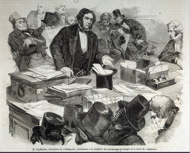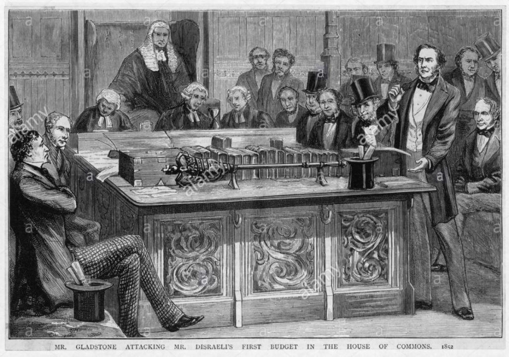 La sutil poesía de un presupuesto inglés es acaso el arte más impenetrable para un desagraciado como Disraeli, que no ha sido educado desde la niñez por las musas de Westminster. Allí, unas leyes misteriosas, pero inexorables, hacen que un penique sobre el azúcar cree de pronto una horrible disonancia (y todos los antiguos habituados rechinan los dientes, mirando con piedad al nuevo director de orquesta), cuando un penique sobre la cerveza acaso hubiera creado para sus oídos las más dulces armonía. La tasa sobre la malta y las economías sobre la Marina se persiguen en un contrapunto difícil, pero rígido, que un secreto instinto revela sin duda a los cancilleres natos del Exchequer. Gladstone, maestro natural de aquel arte austero y sublime, descubrió sin esfuerzo las faltas del principiante.