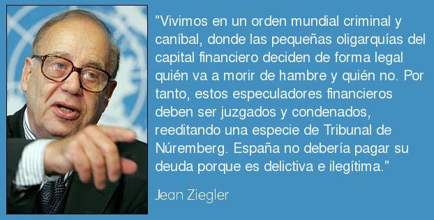 Jean Ziegler (Thun, Suiza, 19 de abril de 1934) fue Relator Especial de ONU para el Derecho a la Alimentación entre 2000 y 2008. Actualmente es vicepresidente del Comité Asesor del Consejo de Derechos Humanos de Naciones Unidas. Es profesor de sociología en la Universidad de Ginebra y la Sorbona, París. Es Doctor en Derecho y Ciencias Económicas y Sociales por la Universidad de Berna. Es autor de numerosos libros, incluyendo El oro nazi, el cual detalla el papel de los banqueros suizos en la retención ilegal de las cuentas inactivas de los judíos víctimas del Holocausto. También sostiene que Suiza es responsable de la prolongación de la Segunda Guerra Mundial por su papel reciclando el oro nazi robado a los países conquistados.