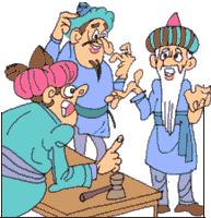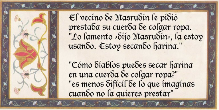 “Mira, si yo tengo que hablar de cosas importantes con un vecino, tengo que invitarle a mi casa, ofrecerle té y halva, hablar con él del tiempo y de la nueva cosecha, luego de su familia, sus hijos, sus hijas, sus nietos. Después le tengo que dar de comer y después de comer otro té y él tiene que preguntarme entonces sobre mi granja y sobre mi familia para finalmente llegar con tranquilidad al tema y tratarlo con cautela. Eso lleva un día entero. Como somos cien familias en el pueblo, tendría que hablar con noventa y nueve cabezas de familia. Estarás de acuerdo conmigo que yo no puedo estar noventa y nueve días seguidos discutiendo con los vecinos. Mi granja se vendría abajo. Lo máximo que podría hacer sería invitar a un vecino a mi casa por semana. Como un año tiene sólo cincuenta y dos semanas, eso significa que me llevaría casi dos años hablar con mis vecinos. Conociendo a mis vecinos como les conozco, te aseguro que todos estarían de acuerdo con hacer llegar el agua al pueblo, porque todos ellos son buenos con los números. Y como les conozco, te digo, que cada uno prometería participar si los otros participasen también. Entonces, después de dos años, tendría que volver a empezar otra vez desde el principio, invitándoles de nuevo a mi casa y diciéndoles que todos están dispuestos a participar.” “Vale”, dijo Nasrudin, “pero entonces en cuatro años estarías preparados para comenzar el trabajo. ¡Y al año siguiente, el canal estaría construido!”