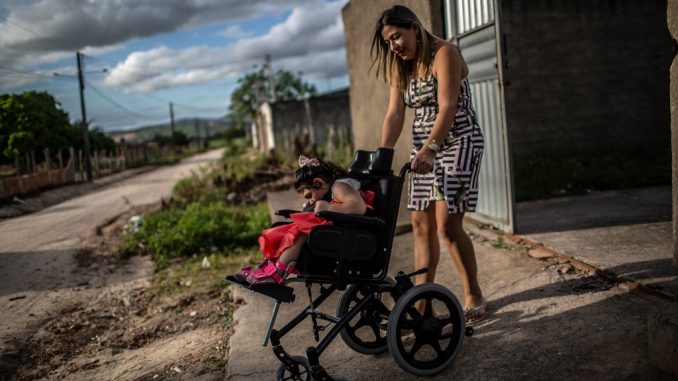 Gisleangela Oliveira dos Santos sale de casa con su hija, que tiene microcefalia. Oliveira dos Santos vio varios videos en YouTube que decían que el zika era una conspiración y se debía a las vacunas.CreditDado Galdieri para The New York Times