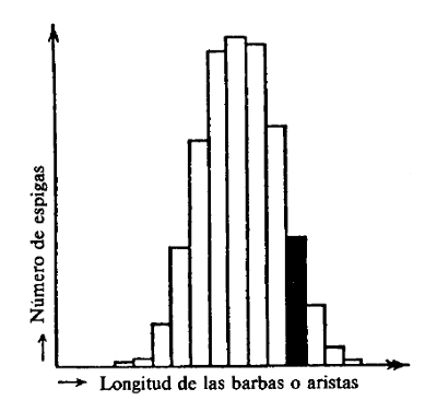 Hoy sabemos con certeza que Darwin estaba en un error al considerar las variaciones pequeñas y continuas que se presentan incluso en la población más homogénea como los fenómenos sobre los que actúa la selección natural. Se ha demostrado que esas variaciones no se heredan. El hecho es suficientemente importante como para ilustrarlo con brevedad. Si tomamos la recolección de una raza pura de cebada, medimos una por una la longitud de las espigas y construimos una gráfica con los resultados, obtendremos una curva acampanada como la de la figura 1, donde en ordenadas se indica el número de espigas de una determinada longitud y en abscisas las diversas longitudes de espiga posible. En otras palabras: domina una longitud media definida, existiendo desviaciones con determinadas frecuencias en cada dirección. Elijamos un grupo de espigas (indicado en negro en la figura) con longitudes considerablemente mayores que la media, pero cuyo número es suficiente para que puedan ser sembradas y den una nueva cosecha. Al hacer la estadística correspondiente, Darwin habría esperado encontrar que la curva se hubiese desplazado hacia la derecha. En otras palabras, se habría esperado producir por selección un aumento de la longitud media de las espigas. Esto no ocurre si se ha empleado una raza de cebada verdaderamente pura. La nueva curva estadística obtenida de la cosecha seleccionada es idéntica a la primera, y habría ocurrido lo mismo en caso de seleccionar para la siembra las espigas especialmente cortas. La selección resulta ineficaz porque las diferencias pequeñas y continuas no se heredan. Es obvio que no radican en la estructura del material hereditario, sino que, evidentemente, son accidentales. No obstante, el holandés Hugo de Vries descubrió hace unos cuarenta años que incluso en la descendencia de cepas realmente puras un número muy pequeño de individuos, algo así como dos o tres entre varias decenas de miles, aparece con cambios pequeños, pero que suponen una especie de «salto».