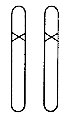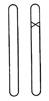 Podríamos esperar que una determinada mutación fuera causada por un cambio en una región determinada de uno de los cromosomas. Y así es. Es importante señalar que sabemos positivamente que se trata de un cambio en solo un cromosoma, pero no en el locus correspondiente del cromosoma homólogo. La figura 2 indica esto esquemáticamente, representando la cruz el locus mutado. El hecho de que solo se vea afectado un cromosoma se revela cuando el individuo mutado (llamado frecuentemente «mutante») se cruza con un individuo no mutado: exactamente la mitad de la descendencia presenta el carácter mutante y la otra mitad el carácter normal. Esto es lo esperable como consecuencia de la separación de los cromosomas en la meiosis del mutante, tal como se ve en la figura 3 de forma muy esquemática. En ella se ve un árbol genealógico que representa cada individuo (de tres generaciones consecutivas) simplemente por el par de cromosomas en cuestión. Tómese nota de que, si el mutante tuviera los dos cromosomas alterados, todos los hijos recibirían la misma herencia (mezclada), distinta de la de cualquiera de ambos padres.