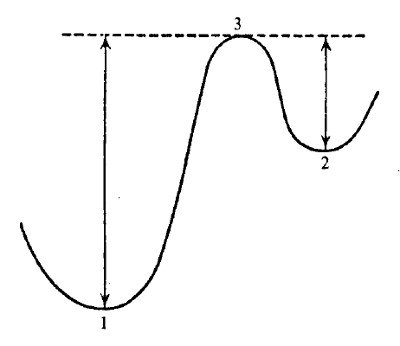 La razón estriba en que las dos configuraciones no son configuraciones vecinas. La transición de una a otra puede tener lugar solo a través de configuraciones intermedias que tienen una energía mayor que cualquiera de ellas. Para expresarlo rotundamente: el oxígeno tiene que ser extraído de una posición e insertado en la otra. No parece existir un medio de hacer eso sin pasar a través de configuraciones con energías considerablemente superiores. Lo que sucede se ilustra a veces como en la figura 2, en la cual 1 y 2 representan los dos isómeros, 3 el umbral entre ellos y las dos flechas las elevaciones, es decir, los aportes de energía requeridos para producir la transición del estado 1 al estado 2, o viceversa. Ahora podemos proceder ya a nuestra segunda corrección, consistente en que las transiciones de este tipo isomérico son las únicas que nos interesan para la aplicación biológica. Eso era lo que pensábamos al explicar la estabilidad en las págs. 31 y 32. El salto cuántico al que nos referimos es la transición desde una configuración molecular relativamente estable a otra. El aporte energético requerido para la transición (cantidad que indicamos por W) no es la verdadera diferencia de niveles, sino el paso desde el nivel inicial hasta el umbral. (Véanse las flechas de la figura 2.)