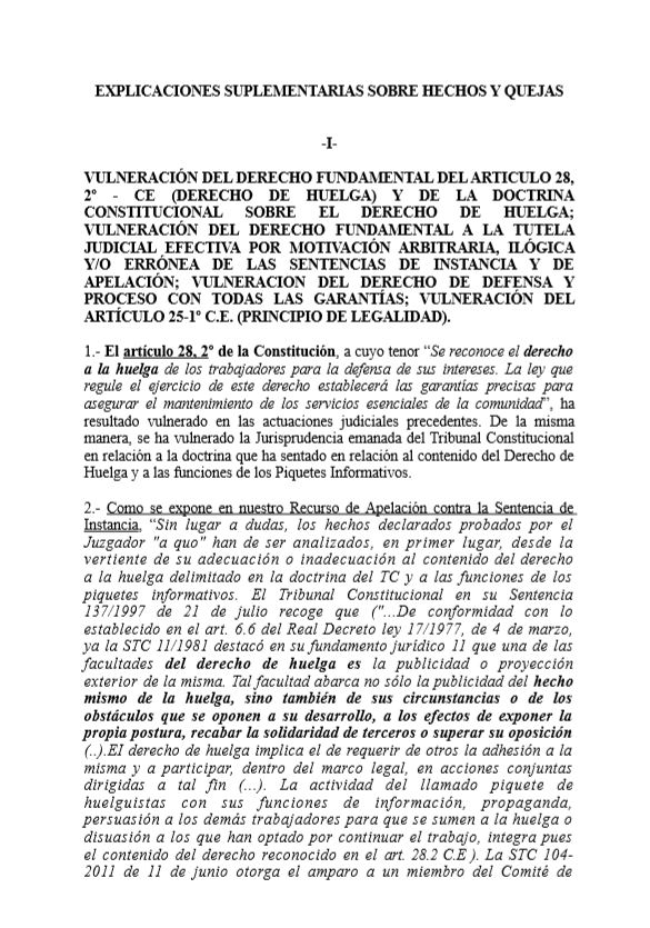 Entendiendo que la acción de Carmen y Carlos venía amparada por la Constitución, resultando no punible, es por lo que en su momento, ante el encargo efectuado a AUSAJ, se planteó el incidente de nulidad de actuaciones y seguidamente el recurso de amparo ante el Tribunal Constitucional y la demanda ante el Tribunal Europeo de Derechos Humanos, cuyos textos íntegros les ofrecemos en este post; interposición que reclamaba una interpretación del precepto penal que delimitase los supuestos y condiciones para que la aplicación de dicho tipo penal resulte compatible con la efectividad del Derecho de Huelga; en especial cuando, como es el caso, se sancione no un Derecho de los Trabajadores, sino del Empresario.