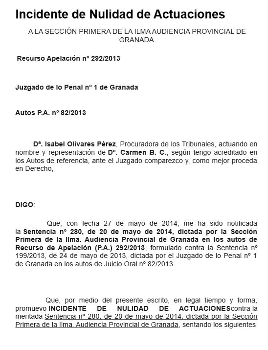 Se interesa de este Tribunal el otorgamiento de amparo a Dª. María del Carmen B.C., en su Derecho Fundamental a la Huelga, así como a la Libertad de Expresión e Información, así como en sus derechos relativos a la Tutela Judicial Efectiva, vulnerando igualmente el Principio de Legalidad del Art. 25 CE; todos ellos vulnerados por la Providencia de 26 de junio de 2014, dictada en los autos de Recurso de Apelación 292/2013, tramitados ante la Sección Primera de la Ilma. Audiencia Provincial de Granada, notificada a esta parte en fecha 1 de Julio de 2014, por la que se inadmite a trámite el Incidente de Nulidad de Actuaciones formulado por esta representación contra laSentencia nº 280, de 20 de mayo de 2014, notificada a esta parte en fecha 27 de mayo de 2014, dictada por la Sección Primera de la Ilma. Audiencia Provincial de Granada en los autos de Recurso de Apelación (P.A.) 292/2013, formulado contra la Sentencia nº 199/2013, de 24 de mayo de 2013, dictada por el Juzgado de lo Penal nº 1 de Granada en los autos de Juicio Oral nº 82/2013, siendo ambas Sentencias, por extensión, también impugnadas en el presente Recurso de Amparo; resoluciones todas ellas, en las que, dicho sea con los debidos respetos y en los más estrictos términos de defensa, se vulneran el Derecho Fundamental a la Huelga enunciado en el Artículo 28, 2º de la Constitución Española, así como el Derecho Fundamental a la Tutela Judicial Efectiva regulado en el artículo 24 de la Constitución y el Principio de Legalidad del Artículo 25, 1º de la misma Norma Fundamental.