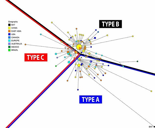 El análisis de las cepas mostró que el tipo A, el virus original que saltó a los humanos de los murciélagos a través de pangolines, no era el más común de China. En cambio, la zona cero de la pandemia fue golpeada principalmente por el tipo B, que estaba en circulación desde la víspera de Navidad.
