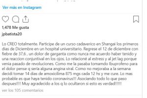 "Participé de un curso cadavérico en Shanghai los primeros días de diciembre en un hospital universitario. Regresé el 12 de diciembre con fiebre de 37.6, un dolor de garganta como nunca me acuerdo haber tenido y una reacción conjuntival en los ojos. Lo relacioné al estrés y al jet lag porque venía pasado de revoluciones", comenzó relatando Batista.