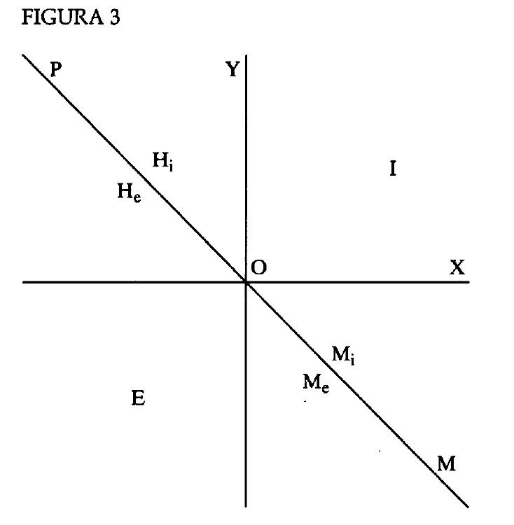Sin embargo, los malvados perfectos son relativamente pocos. La línea OM divide el área M en las dos subáreas Mi y Me, y la gran mayoría de los malvados se sitúan en algún punto de estas dos subáreas.