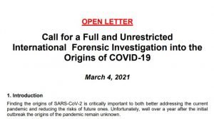 CARTA ABIERTA. Llamamiento para una Investigación forense internacional plena y sin restricciones sobre el origen del Covid-19 (4 marzo 2021). «Ni la OMS ni las autoridades chinas han dado pruebas que demuestren un origen natural de este virus».