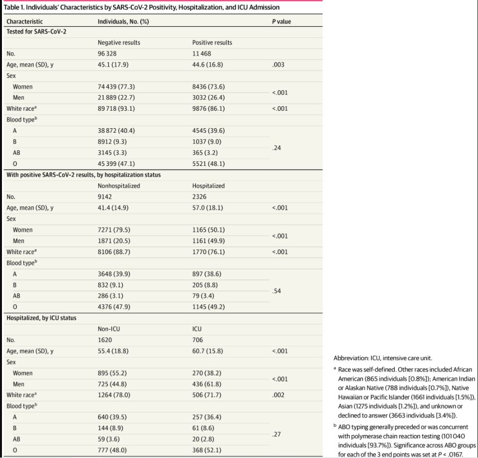 Se incluyó en el estudio a un total de 107 796 personas (edad media [DE], 42,0 [17,8] años; 82 875 [76,9%] mujeres) a las que se les había realizado la prueba de infección por SARS-CoV-2. Otras características demográficas de la población estudiada y asociaciones de grupos sanguíneos ABO se muestran en la Tabla 1.. Entre las personas con COVID-19, la hospitalización se asoció con el sexo masculino (1165 hombres [50,1%] hospitalizados frente a 1871 hombres [20,5%] no hospitalizados) y la edad (edad media [DE] entre los pacientes hospitalizados, 57,0 [18,1] años frente a 41,4 [14,9] años entre los no hospitalizados). La admisión a una UCI también se asoció con el sexo masculino (426 hombres [61,8%] ingresados en UCI frente a 725 hombres [44,8%] no ingresados) y la edad (edad media [DE] entre los pacientes ingresados en UCI, 60,7 [158] años vs. 55,4 [18,8] años en pacientes no ingresados). La raza no blanca, que incluía afroamericanos, indios americanos o nativos de Alaska, nativos de Hawái o de las islas del Pacífico, asiáticos y desconocidos o que se negaron a responder, se asoció con la positividad viral (1592 individuos [13,9%] con resultados positivos frente a 6610 individuos [ 6,9%] con resultado negativo) y hospitalización (556 pacientes [23. 9%] hospitalizados frente a 1036 individuos [11,3%] no hospitalizados). El tipo de sangre no se asoció con la susceptibilidad o la gravedad de la enfermedad, incluida la positividad viral, la hospitalización o la admisión a la UCI (Tabla 1 ). En comparación con la sangre tipo O, el tipo A no se asoció con una mayor positividad viral (OR, 0,97 [IC 95%, 0,93-1,01]; P = 0,11), hospitalización (OR, 0,89 [IC 95%, 0,80-0,99]; P = 0,03), o ingreso en UCI (OR, 0,84 [IC 95%, 0,69-1,02]; p = 0,08) ( tabla 2 ). De manera similar, los tipos B y AB no se asociaron con peores resultados que el tipo O. Los análisis restringidos a la raza blanca produjeron resultados similares ( Tabla 2 ).