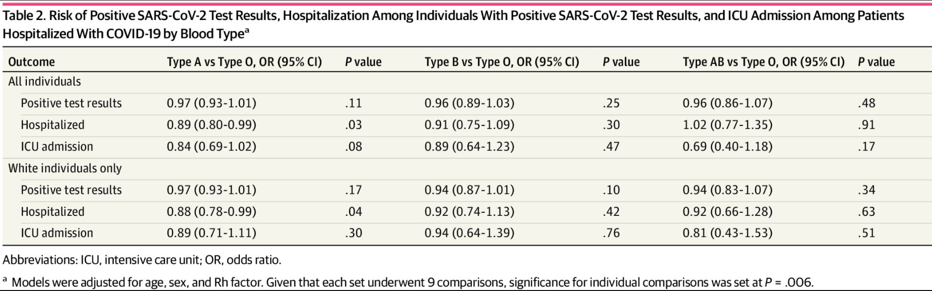 Entre los resultados, el tipo de sangre no se asoció con la susceptibilidad o la gravedad de la enfermedad, incluida la positividad viral, la hospitalización o la admisión a la UCI. En comparación con la sangre tipo O, el tipo A no se asoció con una mayor positividad viral, hospitalización, o ingreso en UCI. De manera similar, los tipos B y AB no se asociaron con peores resultados que el tipo O.