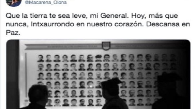 "Que la tierra te sea leve, mi General. Hoy, más que nunca, Intxaurrondo en nuestro corazón. Descansa en Paz", ha puesto Olona en un mensaje en su perfil oficial de Twitter.