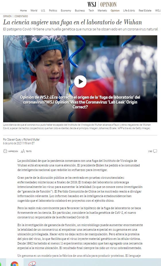 Más de un año después, los principales académicos, políticos y los medios de comunicación finalmente cambiaron y comenzaron a contemplar la posibilidad de que COVID-19 se escapara del Instituto de Virología de Wuhan en China, un laboratorio donde los experimentos incluyeron la manipulación de virus para aumentar su infecciosidad con el fin de estudiar sus efectos potenciales en los seres humanos.