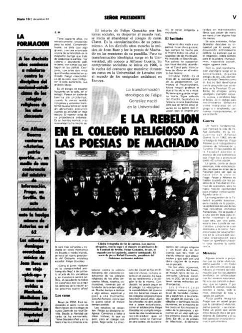 El interés de Felipe González por los temas sociales, su despertar al mundo real, se inicia al abandonar el colegio de curas Claret. Es la <secularización> de su pensamiento. A los dieciséis años escucha la música de Joan Baez y lee la poesía de Machado en las reuniones de su pandilla. Pero su transformación ideológica surge en la Universidad, allí conoce a Alfonso Guerra. Su compromiso socialista se inicia en 1966, a la vuelta del contacto que mantiene durante un curso en la Universidad de Lovaina con el mundo de los emigrados andaluces en Europa.