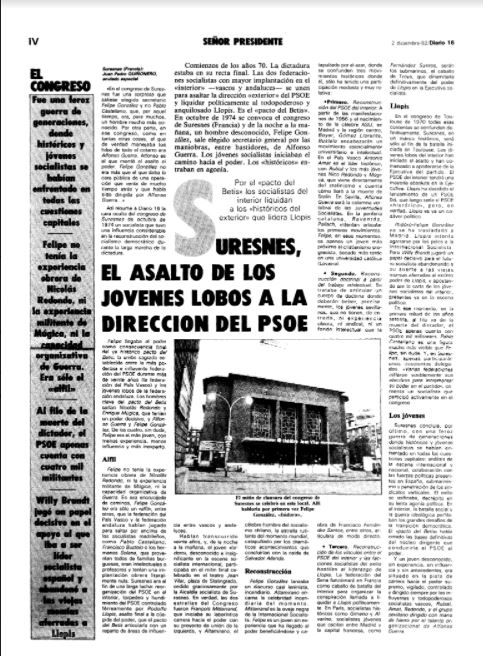 <En el congreso de Suresnes fue una sorpresa que saliese elegido secretario Felipe González y no Pablo Castellano, que por aquel tiempo, era, para muchos, un hombre mucho más conocido. Por otra parte, en ese congreso, como en tantas otras cosas, el que de verdad manejaba los hilos de todo el cotarro era Alfonso Guerra. Alfonso es el que montó el asalto al poder. Felipe González no era más que el que el daba la cara pública de una operación que venía de mucho tiempo atrás y que había sido dirigida por Alfonso Guerra...>