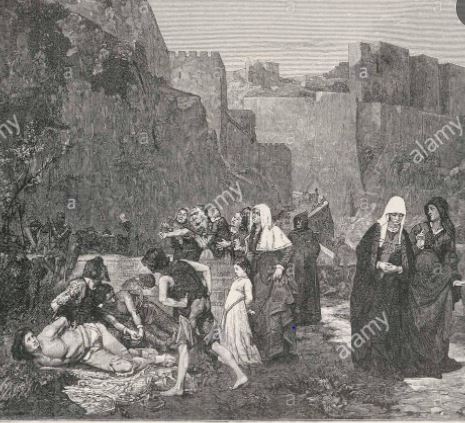 El hambre, las enfermedades y la muerte se cebaron bien pronto en las masas de fanáticos y de aventureros ganosos de botín que cercaban a la ciudad de Aviñón, cuyos alrededores se vieron cubiertos de cadáveres de hombres y caballos. De aquellos cuerpos esparcidos en la llanura, se levantaban enjambres de moscas que infestaban el campamento, no dejando libres ni las mesas de los príncipes, y que esparcían la peste emanada de tantos cuerpos de putrefacción.