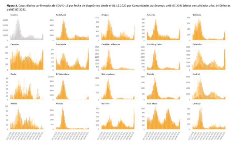Con las gráficas de Simón, y salvo excepciones, se observa un repunte de los casos. No cabe duda. En algunas regiones, como Cataluña o Canarias, la velocidad de reproducción del virus ha provocado un incremento de los contagios muy notable, y muy rápido. La incidencia acumulada a 14 días (IA14d) alcanza, en muchos lugares, valores que se tildan de alarmantes. Ahora bien ¿tiene sentido mantener, tanto esa métrica como sus umbrales, como el de riesgo extremo, cuando se ha quebrado la relación entre contagios, hospitalizaciones en planta, hospitalizaciones en UCI y fallecimientos? Porque esa es la clave. Hasta el mes de enero, al menos, con la vacunación aún incipiente, se podía mantener esa afirmación. Hoy, sin embargo, ya no es posible. No existe una relación entre contagios y el resto de magnitudes, que son las que realmente deberían preocuparnos