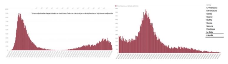 Estos dos gráficos recogen la evolución del número de fallecimientos diarios en España, de acuerdo con las cifras oficiales. Y ojo, que la propia evolución ha provocado un cambio de escala, pasando de un límite hasta 1000 fallecidos diarios en el de la izquierda (rozamos los 900 en los peores momentos de la primavera de 2020) hasta los 600 en el actual, desde enero de 2021. Parece evidente que deberá efectuarse un nuevo cambio de escala si queremos apreciar lo que está ocurriendo, que, aunque sea terrible, gracias a Dios es poco. Tan poco que, como vemos, el CCAES ocupa ya parte del espacio reservado al gráfico para añadir información adicional.