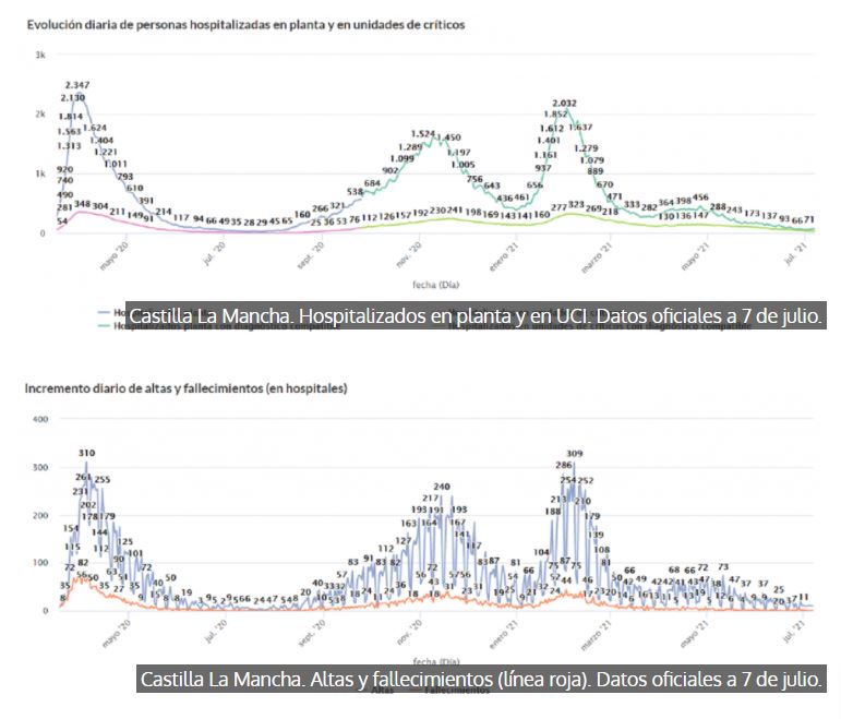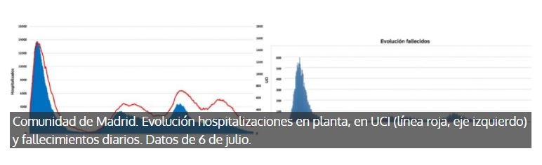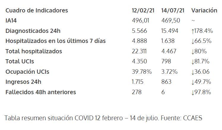 Cinco meses después, el 14 de julio, la IA14 es inferior en sólo 30 puntos. Y así lo reflejan los medios, más preocupados por el titular (“¡Estamos como en febrero!”) que por ahondar en las cifras. Y es que la situación no es ni parecida. Y eso que los casos diagnosticados en 24 horas se han multiplicado por tres. Los 1.638 pacientes que han ingresado en los últimos siete días, sin despreciar cada caso, son una tercera parte que entonces. Sólo una de cada tres camas está hoy ocupada por pacientes Covid, y los que ocupan las UCIs, los más graves, son 798, menos de una quinta parte de los que había entonces, con una tasa de ocupación de menos del 9%. Los fallecidos, siempre demasiados, son 6 en las 48 horas anteriores.