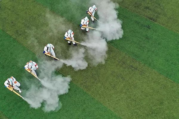 Un equipo de desinfección limpia la escuela de Bozhou, en China. AFP