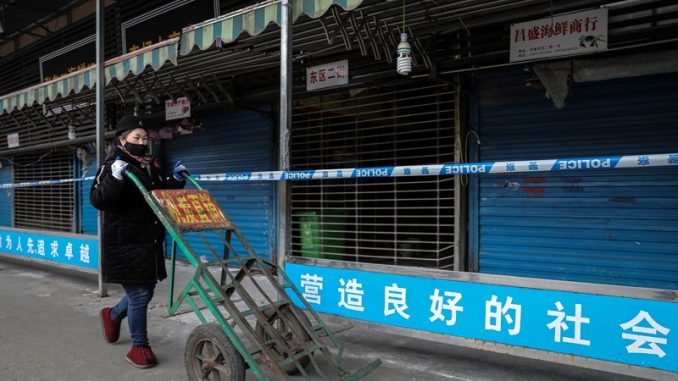 Una mujer empuja un carrito en el mercado mayorista de mariscos cerrado en Wuhan, China, en enero pasado. Crédito: Getty