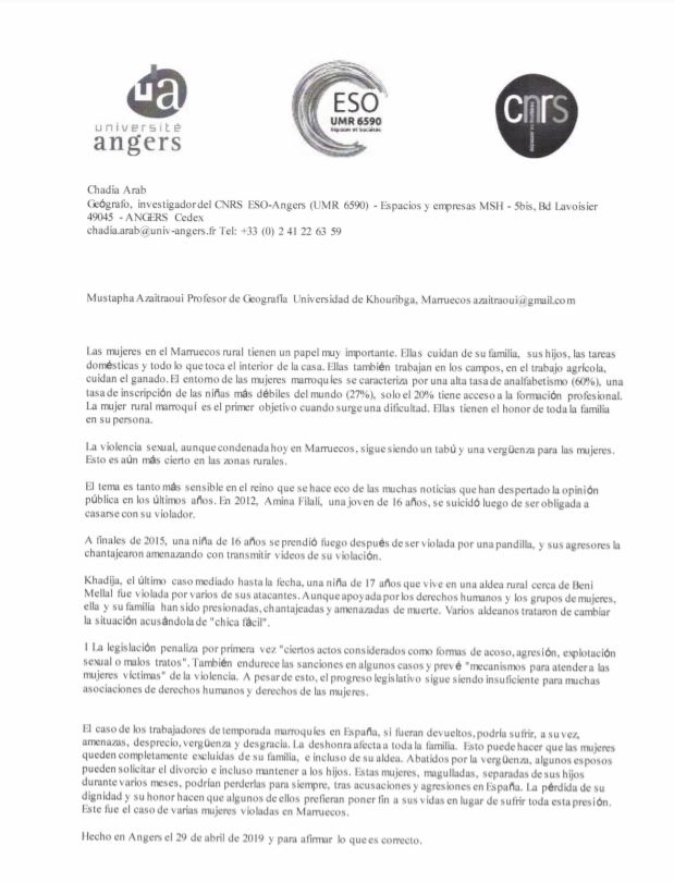 “El caso de las trabajadoras de temporada marroquíes en España, si fueran devueltas, podrían sufrir, a su vez, amenazas, desprecio, vergüenza y desgracia. La deshonra afecta a toda la familia. Esto puede hacer que las mujeres queden completamente excluídas de su familia, e incluso de su aldea. Abatidos por la vergüenza, algunos esposos pueden solicitar el divorcio e incluso mantener a los hijos.