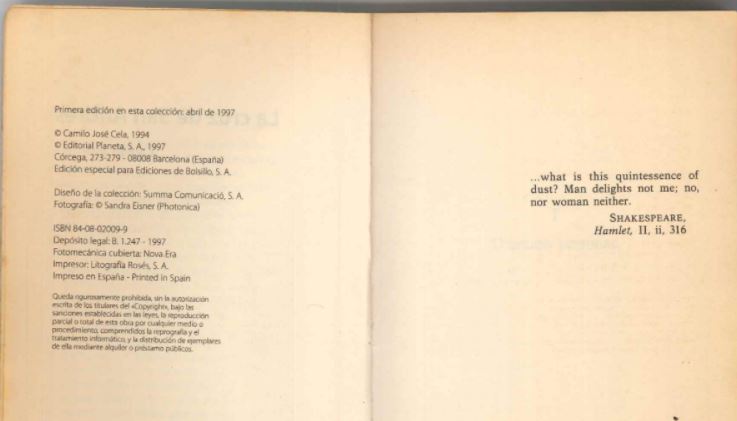 CITA INICIAL DE CAMILO JOSÉ CELA EN "LA CRUZ DE SAN ANDRÉS": HAMLET, ACTO II, escena ii, 316: "¿qué es esta quintaesencia de polvo? El hombre no me deleita; no, ni mujer tampoco". Esta cita conduce directa inmediatamente a la obra de Teatro que Shakespeare ubicó dentro de su obra de Teatro HAMLET: "El asesinato de Gonzaga". Teatro dentro de teatro.