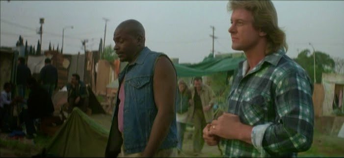 Roddy encuentra trabajo en la obra donde conoce a John Armitage (Keith David, un habitual de las películas de Carpenter). Este le lleva a Chesterville, un lugar donde se alojan los indigentes en tiendas de campaña y chabolas, y donde alguna organización de caridad les da comida. Pronto Frank describe la situación de crisis por la que pasa el país y la resume con la frase: "La ley del dinero. Quien maneja el dinero hace la ley". Ante ese Frank más indignado, Roddy se nos muestra conmo un individuo conformista que cree en el sueño americano: "Seguiré trabajando para ganar algo esperando mi oportunidad. Yo creo en América, respeto las reglas. En estos tiempo todo el mundo pasa apuros". Es decir, el individuo, en palabras del sacerdote, dormido en la domesticación social.