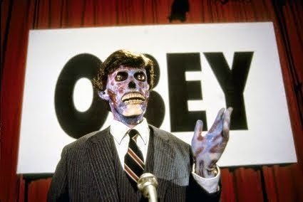 Como dice Slavoj Zizek, la película de John Carpenter "Estan vivos" (They live, 1988) es una de las obras maestras olvidadas - yo matizaría curiosamente olvidadas - de lo que él llama el Hollywood de izquierdas. En todo caso se trata, junto a "La cosa" (The thing, 1982) y En la boca del miedo (In the mouth of madness, 1995), de una de las mejores películas de éste director, que fue también su guionista (con el pseudónimo de Frank Armitage), a quien admiro especialmente por su manera de contar historias de terror y ciencia ficción con originales guiones y presupuestos de bajo nivel. Mi objetivo al tratar esta película, a la que ya he mencionado puntualmente en diferentes ocasiones en este blog, responde a tres motivos: rendir mi pequeño homenaje a John Carpenter, recuperar la plena vigencia del desvelamiento del verdadero rostro del capitalismo disfrazado de democracia que nos propone, y recuperar su valor metafórico para comprender lo real de nuestra estructura psíquica y, en los dos casos, la dificultad y el dolor que supone el despertar del sueño que en ambos casos vivimos para adentrarnos en el más allá del mundo de la ideología que tiene su paralelo psíquico en términos como el ideal del yo y el yo ideal (psicoanálisis), la persona o máscara (análisis junguiano) o el autoconcepto (psicoterapia gestalt), por citar aquellos modelos psicológicos que me son más próximos.