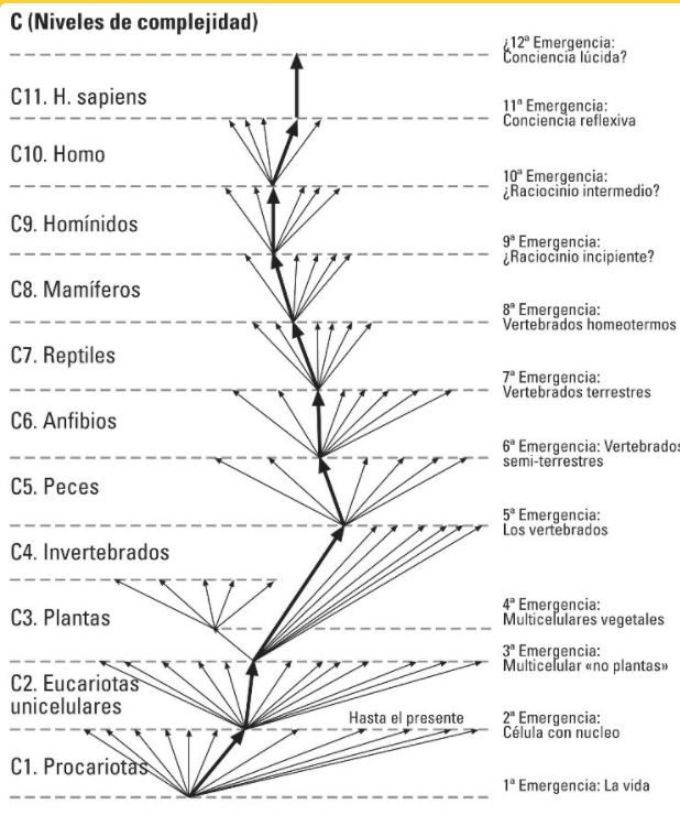 Nuevo árbol de la vida. No es cierto que los peces den lugar a los anfibios. Los peces solo dan lugar a más peces y tan sólo una de sus líneas evolutivas da lugar a los anfibios; tan sólo un anfibio da lugar a los reptiles; tan sólo un reptil da lugar a los mamíferos. Y eso nunca más vuelve a repetirse.