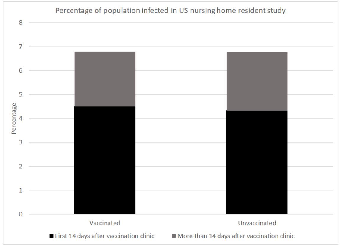 Examinemos ahora algunos ejemplos específicos, por ejemplo, este estudio de residentes de hogares de ancianos en los Estados Unidos. Los resultados muestran que durante el transcurso del estudio, el 6,8 % de la población vacunada se infectó y el 6,8 % de la población no vacunada se infectó. Sin embargo, al decidir que se deben excluir los primeros 14 días después de la vacunación, el área gris para el grupo vacunado se compara con el área negra y gris combinada para los no vacunados. Hacerlo podría conducir a la afirmación de una eficacia de la vacuna del 66% contra la infección. Los autores de este estudio fueron lo suficientemente honestos como para compartir los datos sin procesar y no afirmaron tener una eficacia del 66 %.