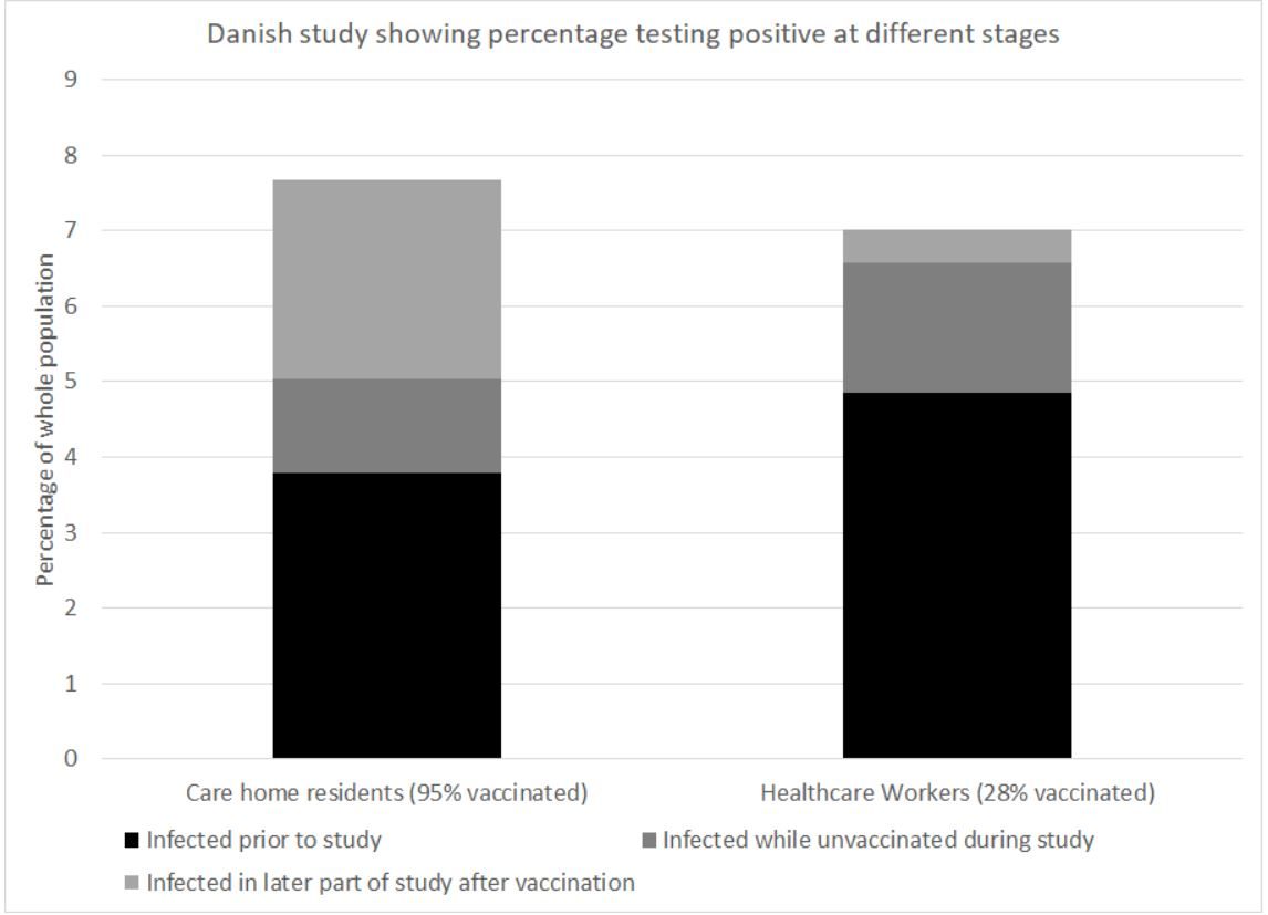 Para tomar un segundo ejemplo, un periódico danés midió el número de infecciones en trabajadores de la salud y residentes de hogares de ancianos. Antes del inicio del programa de vacunación, el 4,8% de los trabajadores de la salud estaban infectados y el 3,8% de los residentes de residencias lo estaban. El estudio finalizó al final de la ola de invierno danesa después de que el 95% de los residentes de los hogares de ancianos hubieran sido vacunados y el 28% de los trabajadores de la salud lo hubieran sido. Dada la peor posición al principio y la tasa de vacunación más baja en los trabajadores de la salud, se podría esperar que estuvieran peor en general. Sin embargo, el porcentaje de infectados al final de la ola era del 7,0% entre los trabajadores de la salud, pero del 7,7% entre los residentes de residencias.