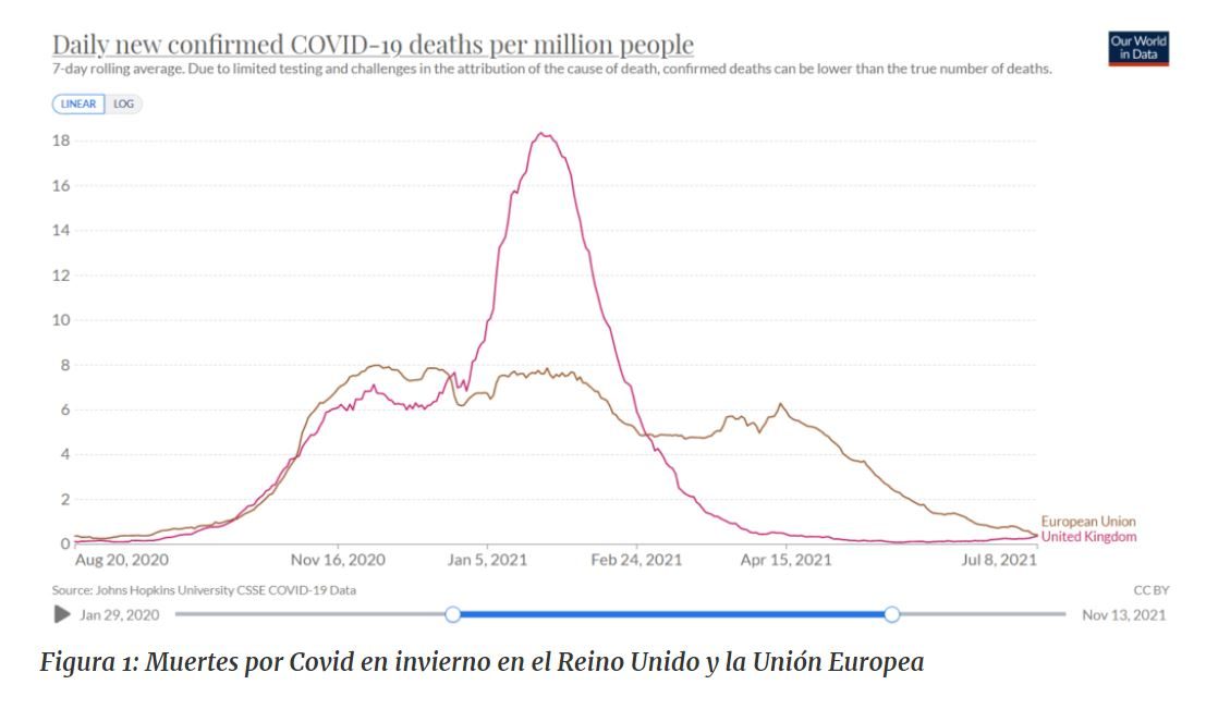 Este punto es de particular relevancia para las comunidades muy unidas donde muchos están siendo vacunados al mismo tiempo, como las escuelas y, en particular, las comunidades con un alto número de personas vulnerables, como los hogares de ancianos y los hospitales. Lo que estamos haciendo efectivamente es 'acelerar' la ola de infecciones (y muertes). En última instancia, al final de la temporada viral, murió la misma cantidad de personas. Debido a que excluimos las muertes anteriores (1 a 14 días), nos engañamos al pensar que las vacunas fueron más efectivas de lo que realmente fueron. Al observar solo el período posterior y ver menos muertes durante ese tiempo, se creó la ilusión de que se salvaron vidas. Esto es evidente en los datos de muchos países después del lanzamiento de la vacuna. El siguiente gráfico que muestra el Reino Unido frente a Europa ilustra este punto, ya que el Reino Unido fue el más rápido en implementar la vacuna.
