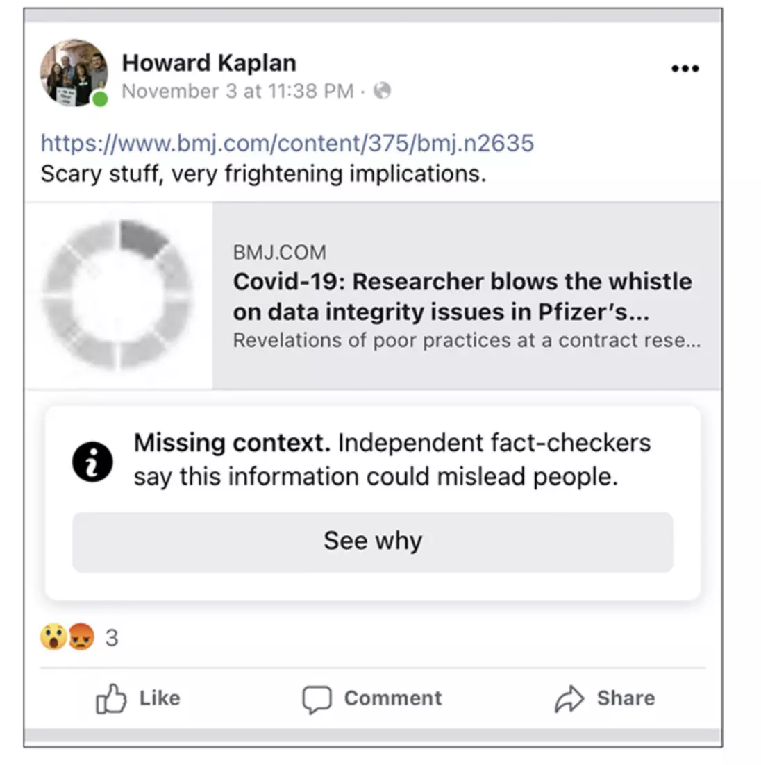 La revista BMJ, una de las más antiguas y prestigiosas publicaciones de medicina del mundo, se enfrenta a Facebook y sus empresas de verificación de datos (fact-checking) después de que una de sus investigaciones fuera etiquetada erróneamente como "carente de contexto" y censurada en la red social más grande del mundo.