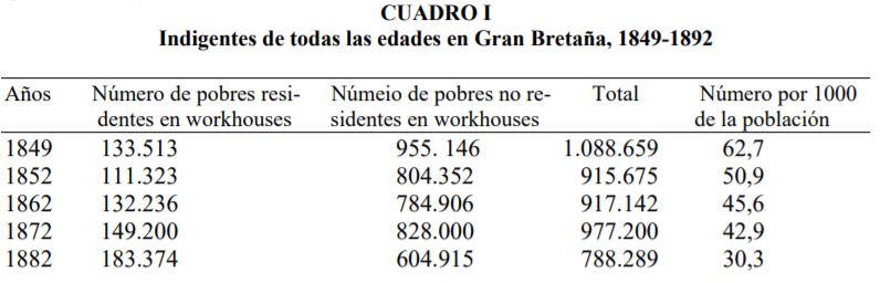 los hombres hasta 1884, fecha en que el voto se extendió a la mayoría de los varones adultos. La financiación de este sistema de ayuda pública provenía de los impuestos recaudados por las autoridades locales. La carga financiera sobre el gobierno central era muy pequeña, ya que consistía principalmente en los salarios y los gastos administrativos de tres comisionados y varios comisionados adjuntos.Después de la reforma de 1834, el número de indigentes disminuyó considerablemente en Gran Bretaña y, como puede verse en el cuadro I, en forma aun más acentuada en proporción al rápido aumento de la población.