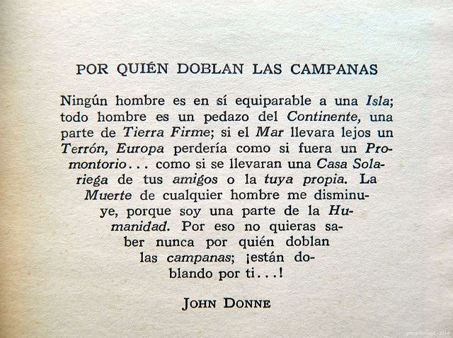 Si el mar se lleva una porción de tierra, toda Europa queda disminuida, como si fuera un promontorio, o la casa de uno de tus amigos, o la tuya propia.Ninguna persona es una isla; la muerte de cualquiera me afecta, porque me encuentro unido a toda la humanidad; por eso, nunca preguntes por quién doblan las campanas; doblan por ti.