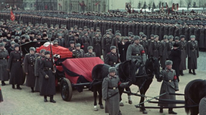 Volvemos a ver los mismos rostros en State funeral, documental construido a partir del pietaje tomado en marzo de 1953 por más de 150 cinefotógrafos a lo largo y ancho de la Unión Soviética. Como lo expresa el título, estamos ante el mayúsculo funeral de Estado organizado para homenajear al heroico y casi sobrenatural cadáver de Iósif Stalin, quien murió el 5 de marzo de 1953. Luego de ser embalsamado, el cuerpo de Stalin sería mostrado a los ciudadanos soviéticos en la Sala de las Columnas, el mismo escenario de The trial, donde se había llevado a cabo la primera de sus innumerables purgas políticas.
