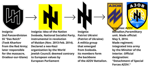La integración de estos paramilitares a la Guardia Nacional no estuvo en absoluto acompañada de una “desnazificación”, como pretenden algunos. Entre los muchos ejemplos, el de la insignia del Regimiento Azov es edificante: