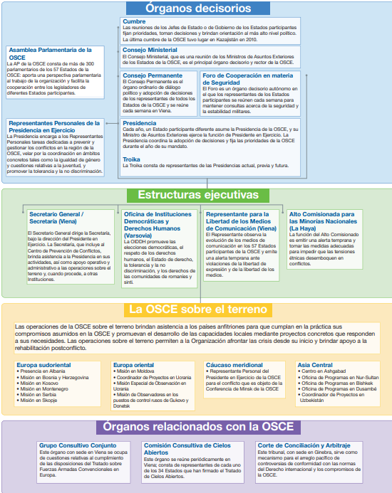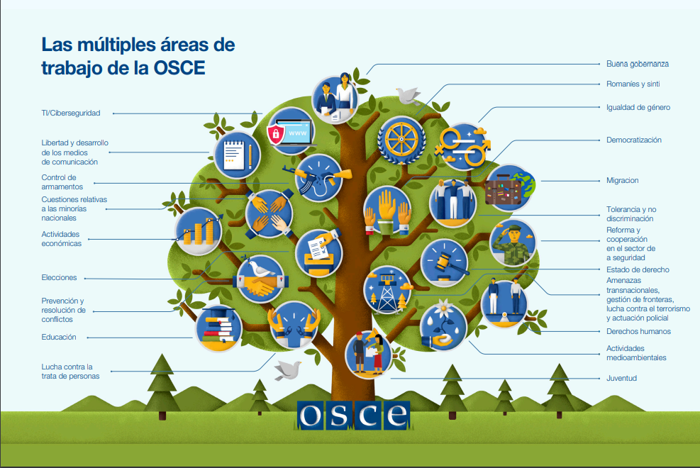 Como señala la propia OSCE, "Mediante la labor de sus unidades de expertos, sus instituciones y su red de operaciones sobre el terreno, la OSCE aborda cuestiones que afectan directamente a nuestra seguridad común, tales como el control de armamentos, la buena gobernanza, la seguridad energética, la trata de personas, la democratización, la libertad de los medios de comunicación y las minorías nacionales"; "la OSCE, con sus 57 Estados participantes en América del Norte, Europa y Asia, es la organización de seguridad regional más grande del mundo. La OSCE trabaja para alcanzar y mantener la estabilidad, la paz y la democracia de más de mil millones de personas a través del diálogo político y proyectos sobre el terreno".