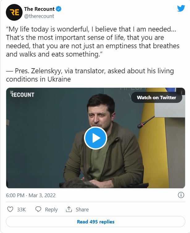 Para mí, esta construcción es alarmante: implica que Zelensky disfruta de la oportunidad única de actuar en un escenario global que brinda la guerra. Hizo su vida hermosa; el Vive. En contraste con millones de ucranianos cuya vida no es nada agradable y miles de aquellos que ya no están vivos.