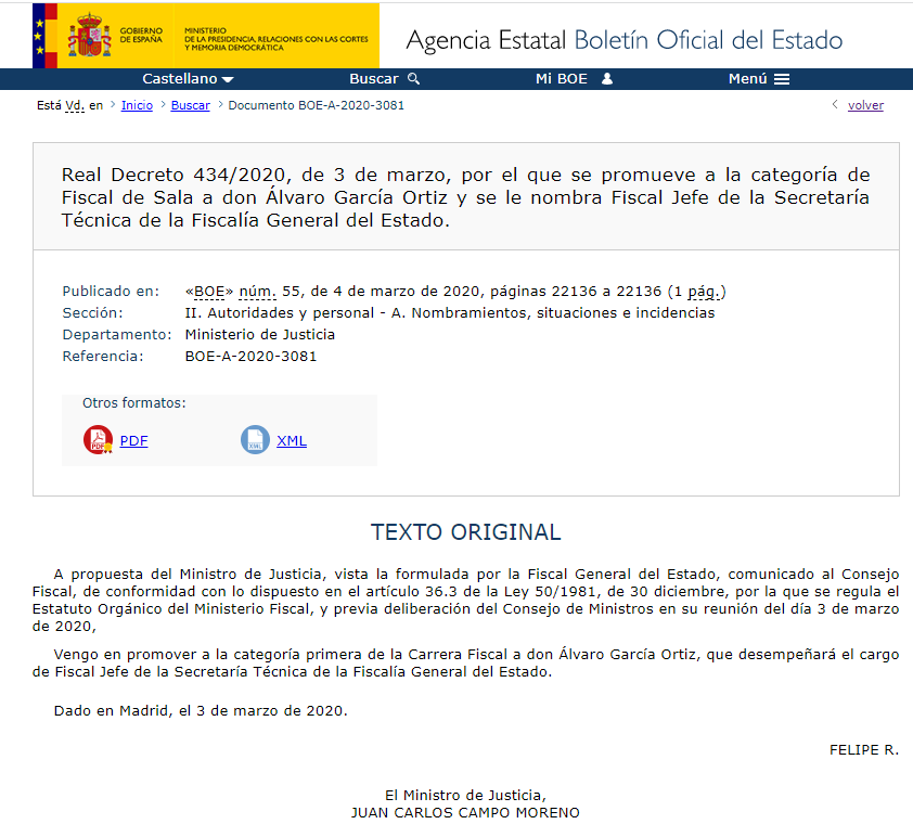 El último hito, su penúltimo nombramiento como Fiscal Jefe de la Secretaría Técnica de la FGE, en cuya virtud se convirtió, sin más, en Fiscal de Sala del Tribunal Supremo, lo más alto. Bueno, casi. Lo más alto le llegó ahora, y de la misma manera arbitraria, sino directamente corrupta: FGE.