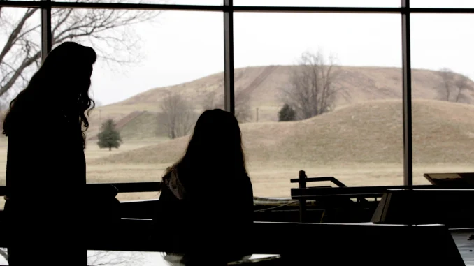 CAHOKIA MOUNDS, ILLINOIS ( Scheerpost ) – Estoy parado sobre un montículo de templo de 100 pies de altura, el movimiento de tierra más grande conocido en las Américas construido por pueblos prehistóricos. Las temperaturas, en los altos 80, junto con la humedad opresiva, han vaciado el parque de casi un puñado de visitantes. Mi camisa está empapada de sudor.