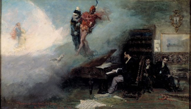 El óleo Fantasía sobre Fausto (1866) es obra de Mariano Fortuny Marsal, pintor miniaturista español. Recoge el momento de una velada en el estudio de su amigo, el también pintor Francisco Sans Cabot. Lorenzo Casanova y Agapito Francés son los nombres de las dos figuras que escuchan atentamente la melodía del piano, en el que se interpreta una “Fantasía” sobre la ópera Fausto, estrenada durante esos años. La estancia en la que tiene lugar la audición se inunda de una niebla de la que emergen Mefistófeles, vestido de rojo, y la vieja Marta, cogida del brazo para distraer su atención sobre Margarita, cuya silueta se aprecia al fondo de la neblina. Sería una escena en la que el maestro nos muestra su propio mundo, en el que se siente integrado y feliz. El cuadro se conserva en el Museo del Prado, en Madrid.