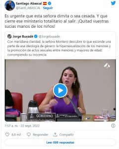 El presidente de Vox, Santiago Abascal, ha salido al paso de estas disparatadas declaraciones pidiendo la dimisión o el cese de Irene Montero y el cierre de "ese ministerio totalitario". Termina el tuit diciendo "¡Quitad vuestras sucias manos de los niños!".